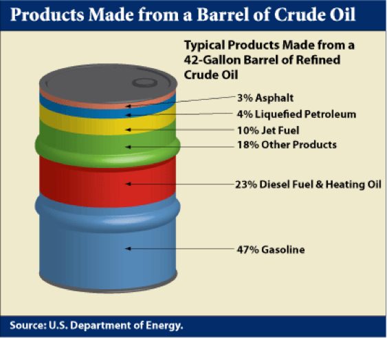 The following animation shows a refinery flow chart indicating some of the major refinery processes and refinery products. Note that the distillation process (Fractionation Tower) separates crude oil into a number of distillate fractions that are sent as feedstocks to different processes, some of which are interconnected. It is also important to recognize that petroleum refining not only produces transportation fuels and fuels for space heating or industrial furnaces but also produces materials needed for the operation of the combustion engines and paving the roads for vehicles to travel on.