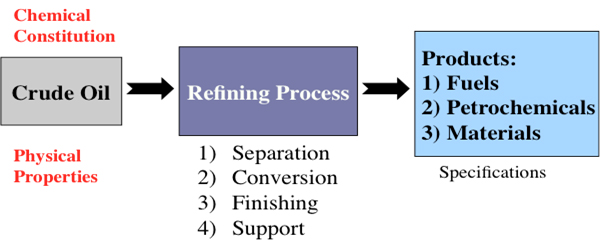 Figure (1.1) indicates that chemical constitution and physical properties of crude oils are important parameters that guide the refinery configurations. The refining processes can be divided into four groups, as indicated. While the separation processes involve just physical phenomena, the conversion, finishing, and support processes require chemical changes, i.e., breaking chemical bonds to modify the molecular structure of the feedstocks. These changes are necessary to produce the fuels and materials in accordance with industrial/commercial specifications.