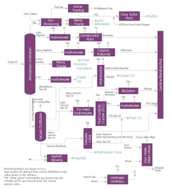 This is a schematic process flow diagram of the processes used in a typical oil refinery.